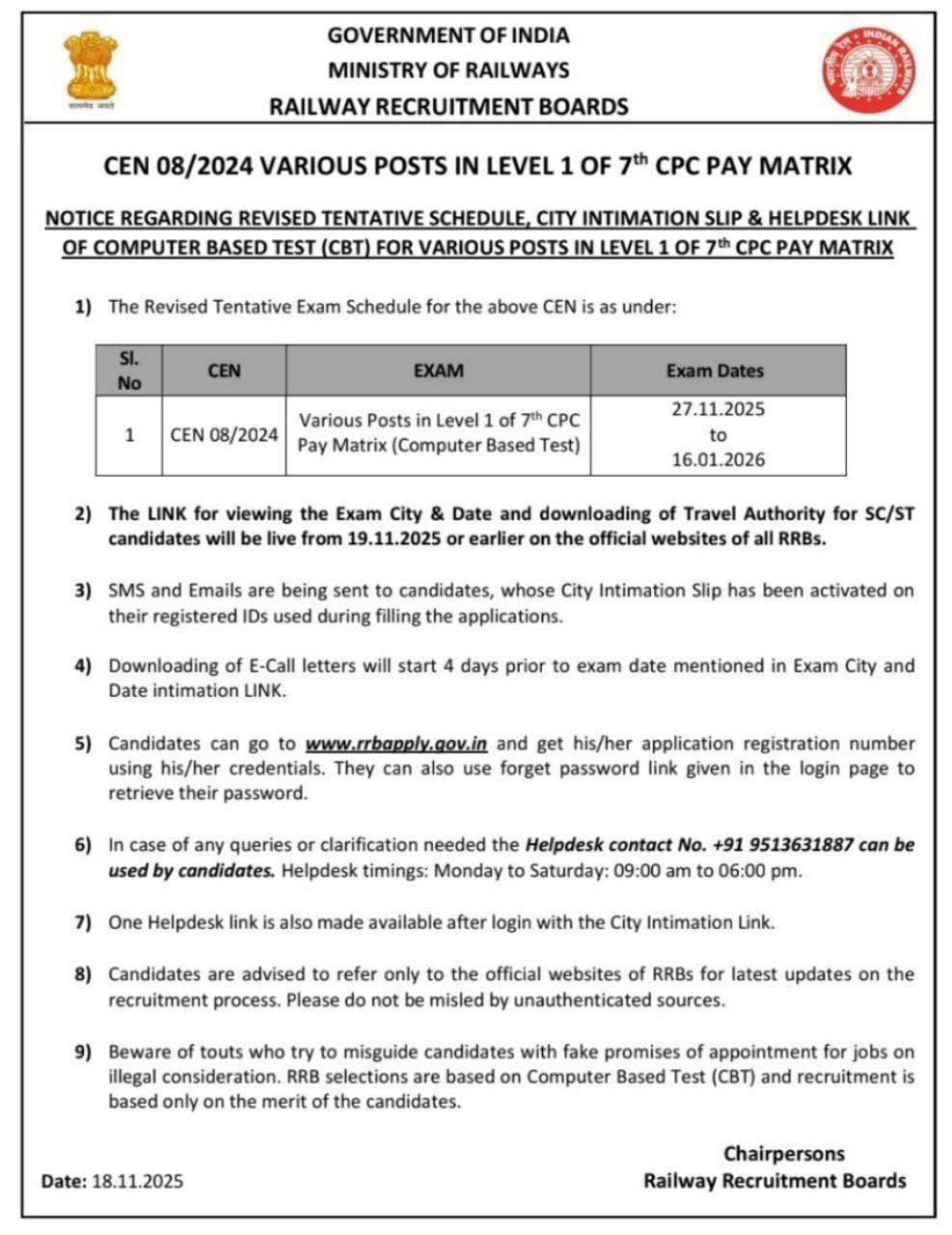 Information: The Railway Recruitment Board (RRB) has activated the application-status link for the massive Group D (Level-1) recruitment drive, CEN No. 08/2024, offering 32,438 vacancies across Indian Railways. This recruitment falls under the 7th Central Pay Commission pay matrix Level 1, and it remains one of the most sought-after government opportunities for candidates seeking a stable railway career.
